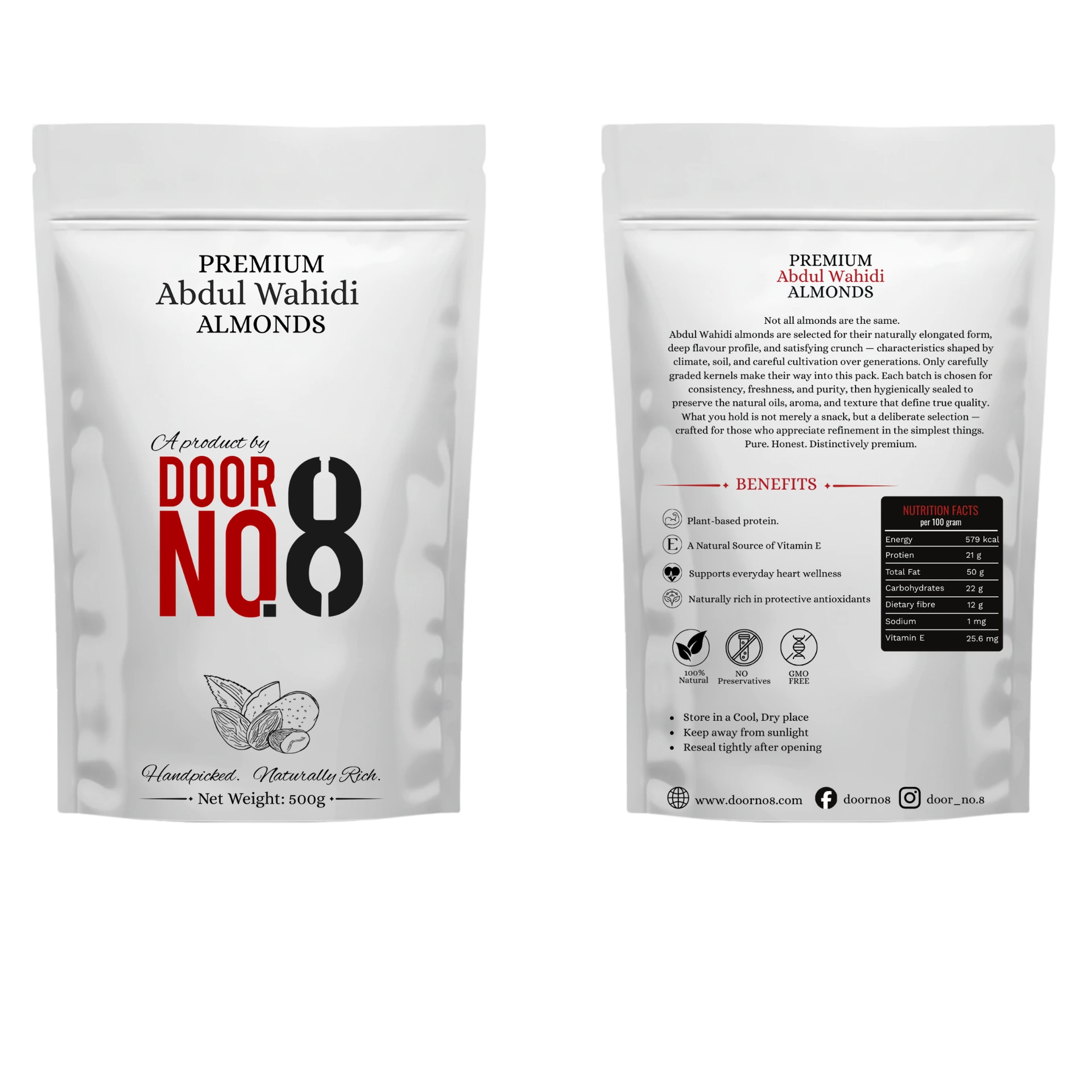 At Door No. 8, our Abdul Wahidi almonds are selected with intention. Only kernels that meet our standards of size, integrity, and freshness are chosen. Each batch is carefully graded and hygienically packed to preserve the natural oils, aroma, and texture that define exceptional quality.