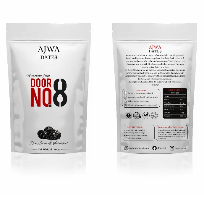 "Indulge in the exquisite taste of Ajwa Dates from Door No. 8, a symphony of rich flavors and nutritional goodness. Sourced from the fertile lands of Saudi Arabia, these premium dates are not only a delight to the palate but a nourishing treat for the body. Experience a touch of natural luxury with every bite, only with Door No. 8."