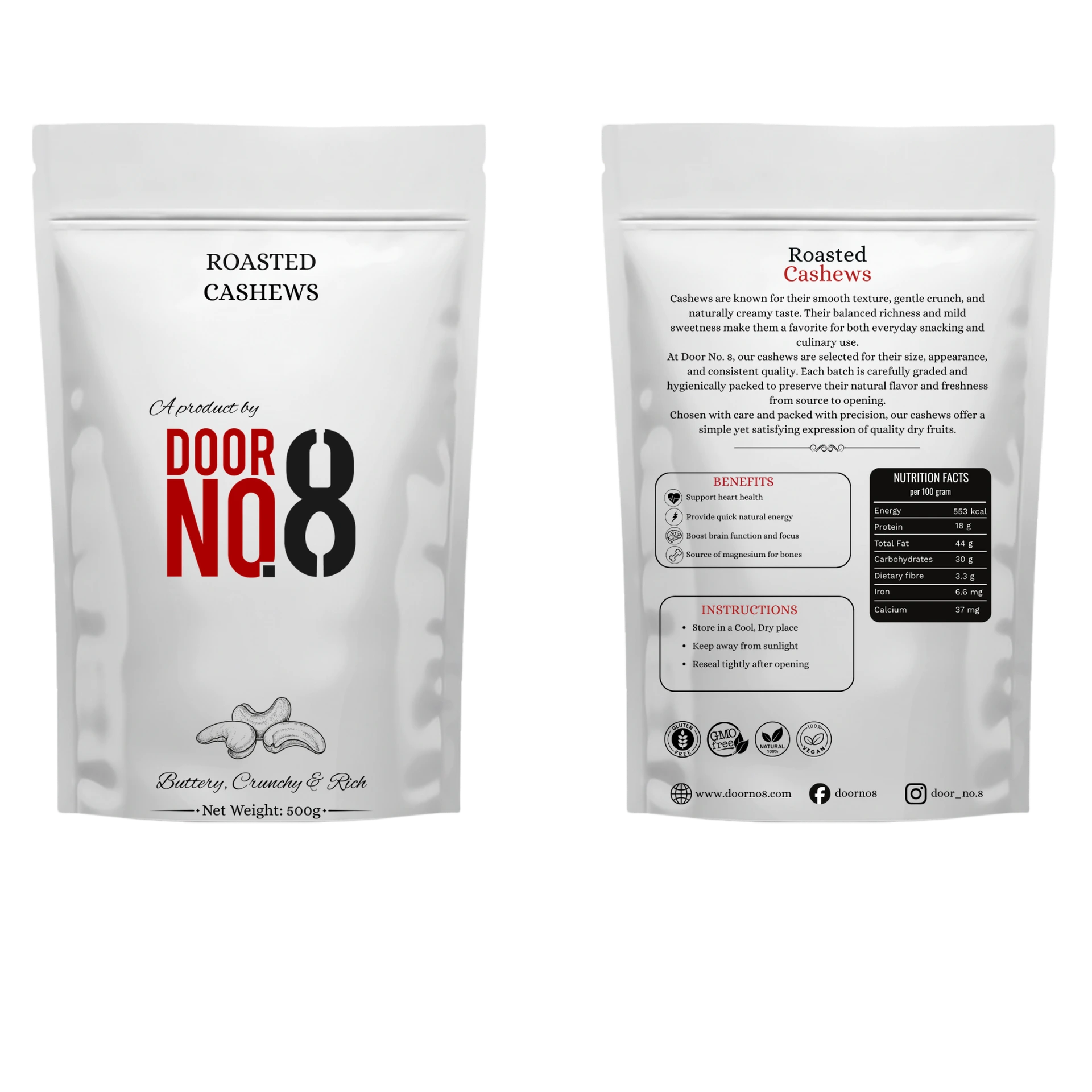 At Door No. 8, our roasted cashews are selected for their size, quality, and consistency. Each batch is carefully roasted under controlled conditions and hygienically packed to maintain freshness, texture, and taste from source to opening.